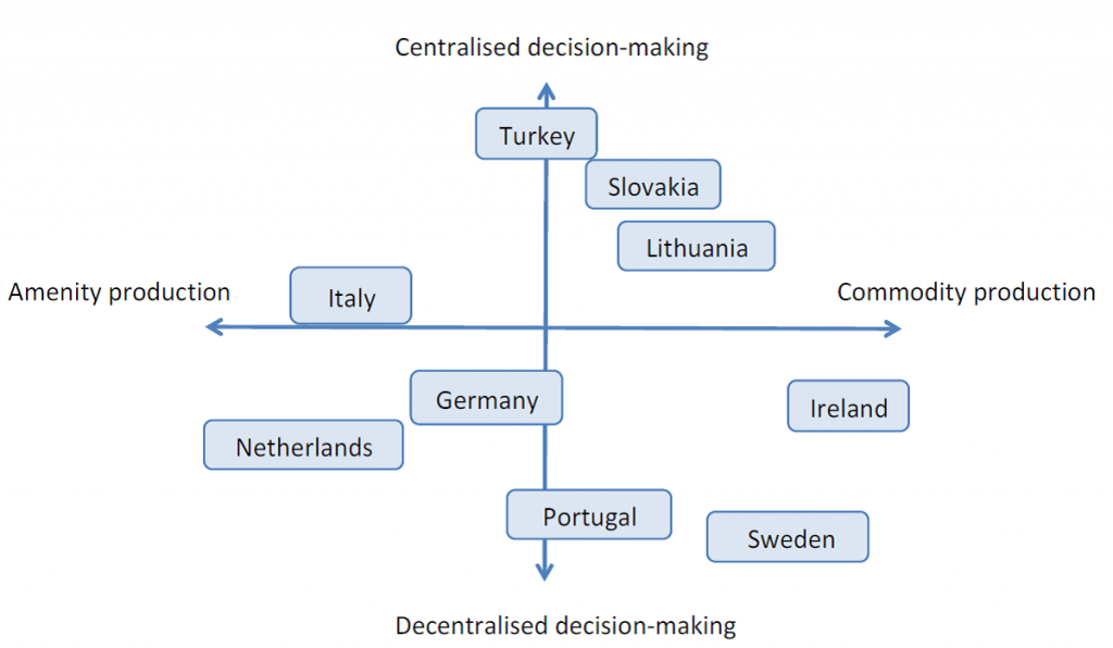 V rámci EÚ existuje veľké množstvo prístupov k obhospodarovaniu lesov, sociálno-ekologických prostredí a kontextov riadenia. Obrázok poskytuje predbežný prehľad krajín v rámci konzorcia ALTERFOR, ilustrujúci ich súčasnú orientáciu na politiku v porovnaní s výrobou komodít a stupňom centralizácie pri rozhodovaní v lesnom hospodárstve.